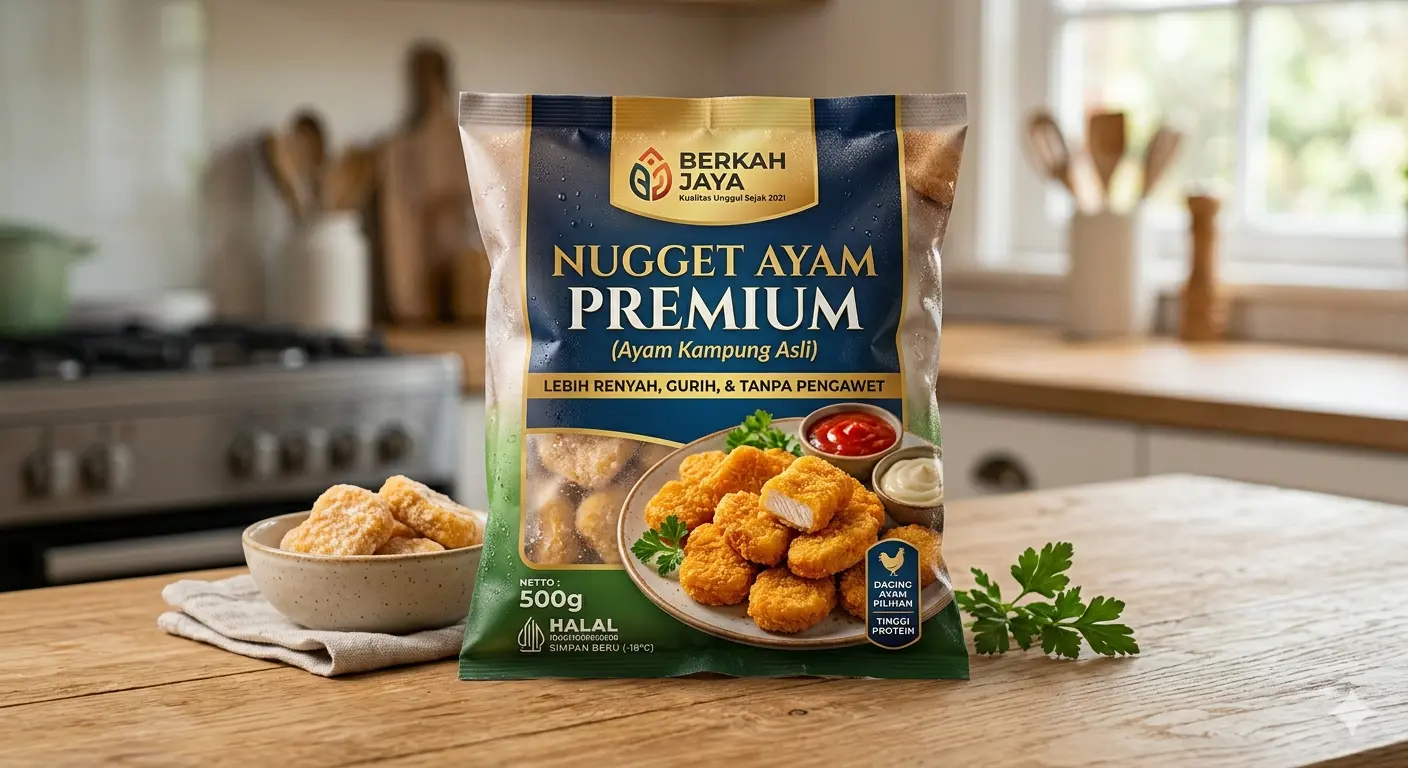 Kandungan daging ayam murni 85%. Stok tersedia: 2.500 Box/hari.